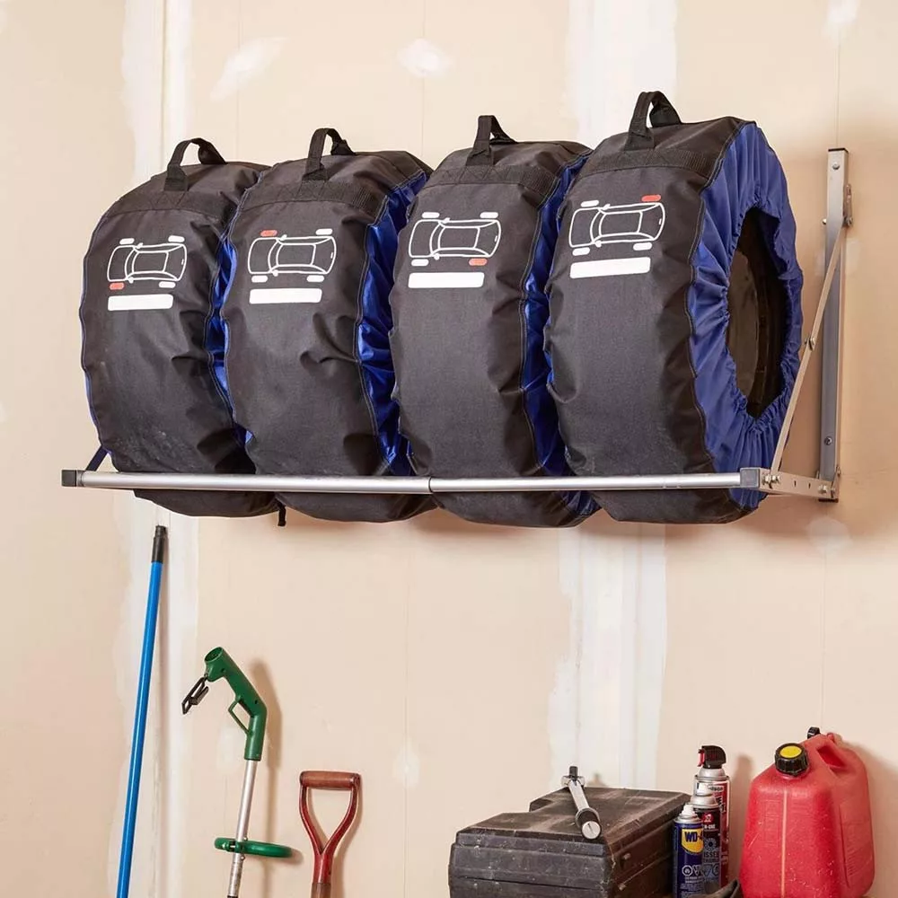 A szezonváltások közötti időszakban praktikus és helytakarékos megoldás a falra szerelhető autógumi állvány. Használhatod otthon vagy autószerelő műhelyben egyaránt, hogy elkerüld a rendezetlenséget.
