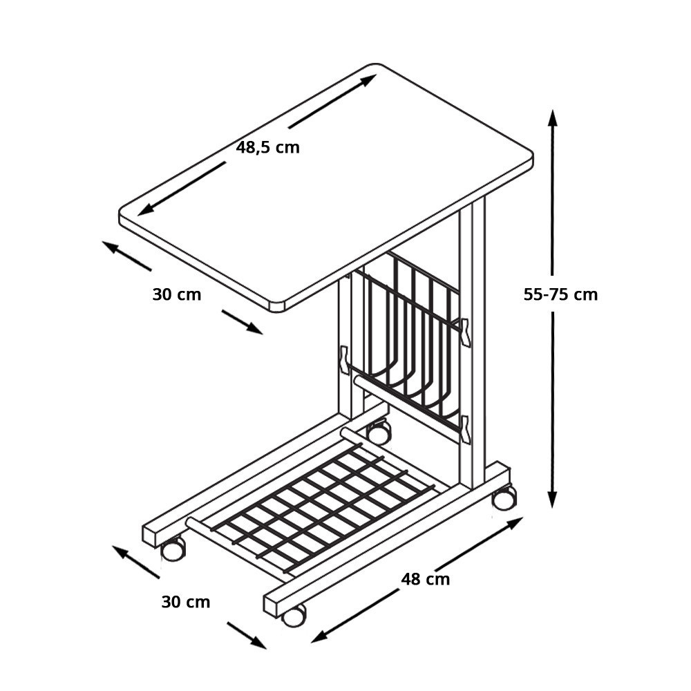 Az állvány masszív fém váza és a minőségi fa asztallap garantálja a hosszú élettartamot. Kompakt, mégis tágas tárolóhelyeket kínál: az alsó polcon akár kisebb tárgyakat is elhelyezhetsz, míg az oldalsó tárolóban könyveket, magazinokat vagy egyéb kiegészítőket tarthatsz.