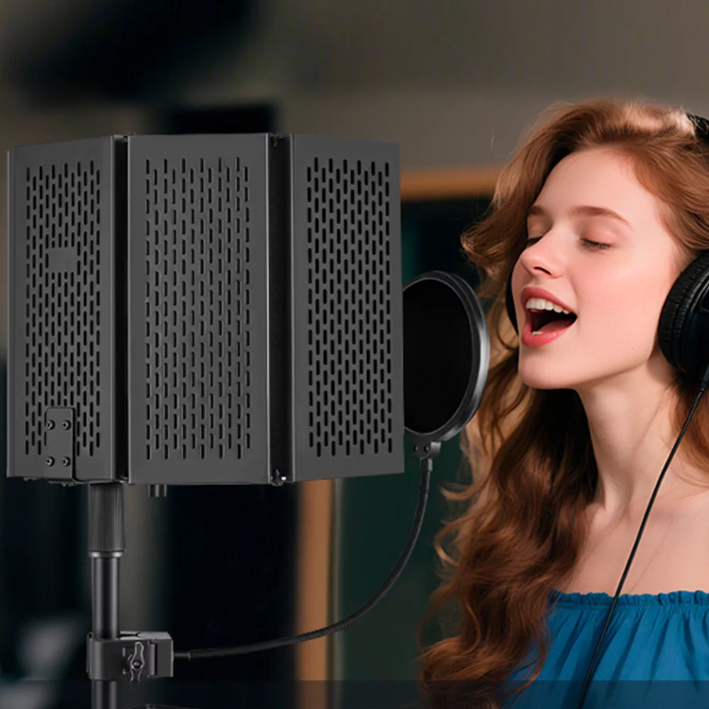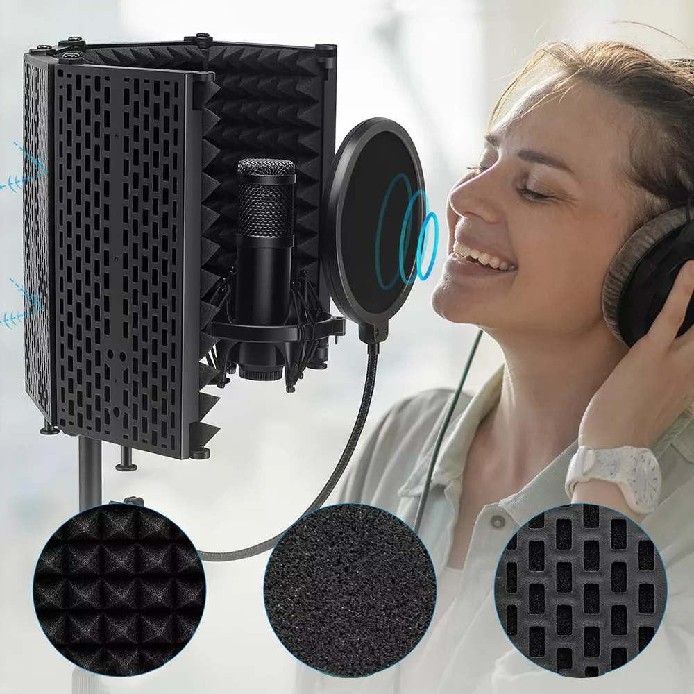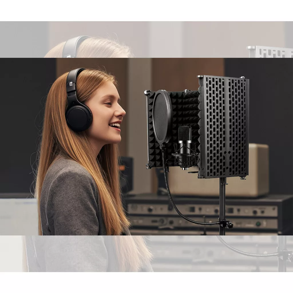 A mellékelt ívelt akusztikai szivacs hatékonyan elnyeli a visszhangot és a külső zajokat, így a felvétel fókuszban tartja a hangod minden árnyalatát. A beépített pop-filter megszűri a pattogó hangokat (pl. P és B), így a felvételeid még professzionálisabbak lesznek.