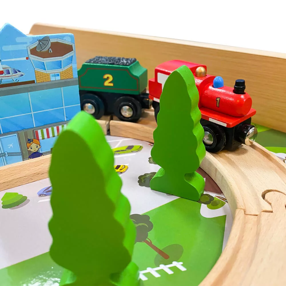 A terepasztal számos játékelemet tartalmaz, amelyek segítségével a gyerekek változatos jeleneteket építhetnek fel. A vonatsínek és a közlekedési táblák interaktívvá teszik a játékot, miközben a gyerekek észrevétlenül sajátítják el a közlekedési szabályokat. A híd, a fák és a kis házak tovább növelik a játékélményt, lehetőséget adva egyedi városok kialakítására.
