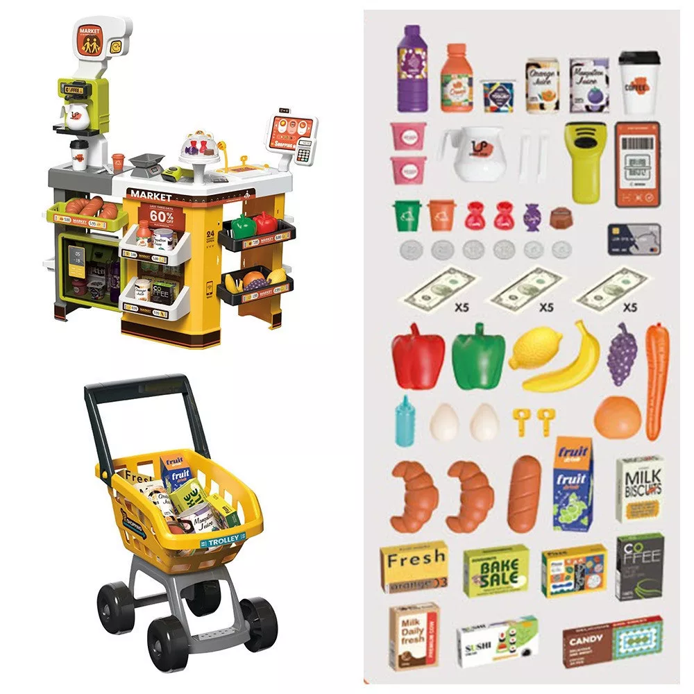 A játék szupermarketek számos változatban elérhetők, tartalmazhatnak játék élelmiszereket, péksüteményeket, bevásárlókosarakat, szkennereket, pénztárgépeket és játékpénzt. Az élethű kiegészítők lehetővé teszik, hogy a gyerekek különböző vásárlási szituációkat próbálhassanak ki.