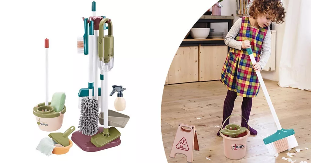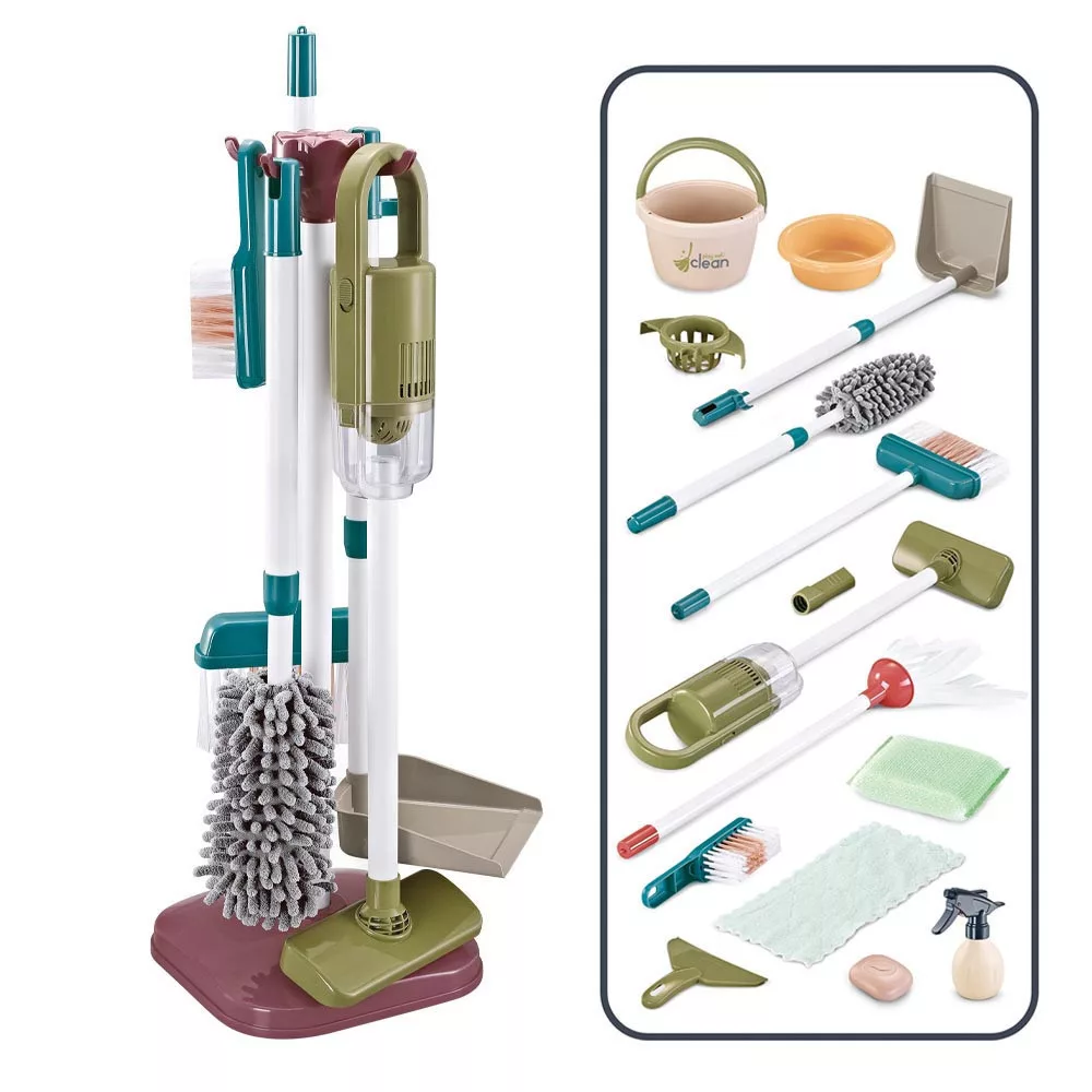 A csomagban minden szükséges eszköz megtalálható, ami a háztartási takarításhoz kellhet. A felmosó, seprű, vödör és kefe a különböző tisztítási feladatokat szimulálja, miközben a törlőrongy és szivacs a részletek tisztításában segít. Az álló játék porszívó élethű hanghatással rendelkezik, amely még élvezetesebbé teszi a takarítós szerepjátékot.