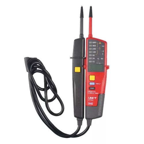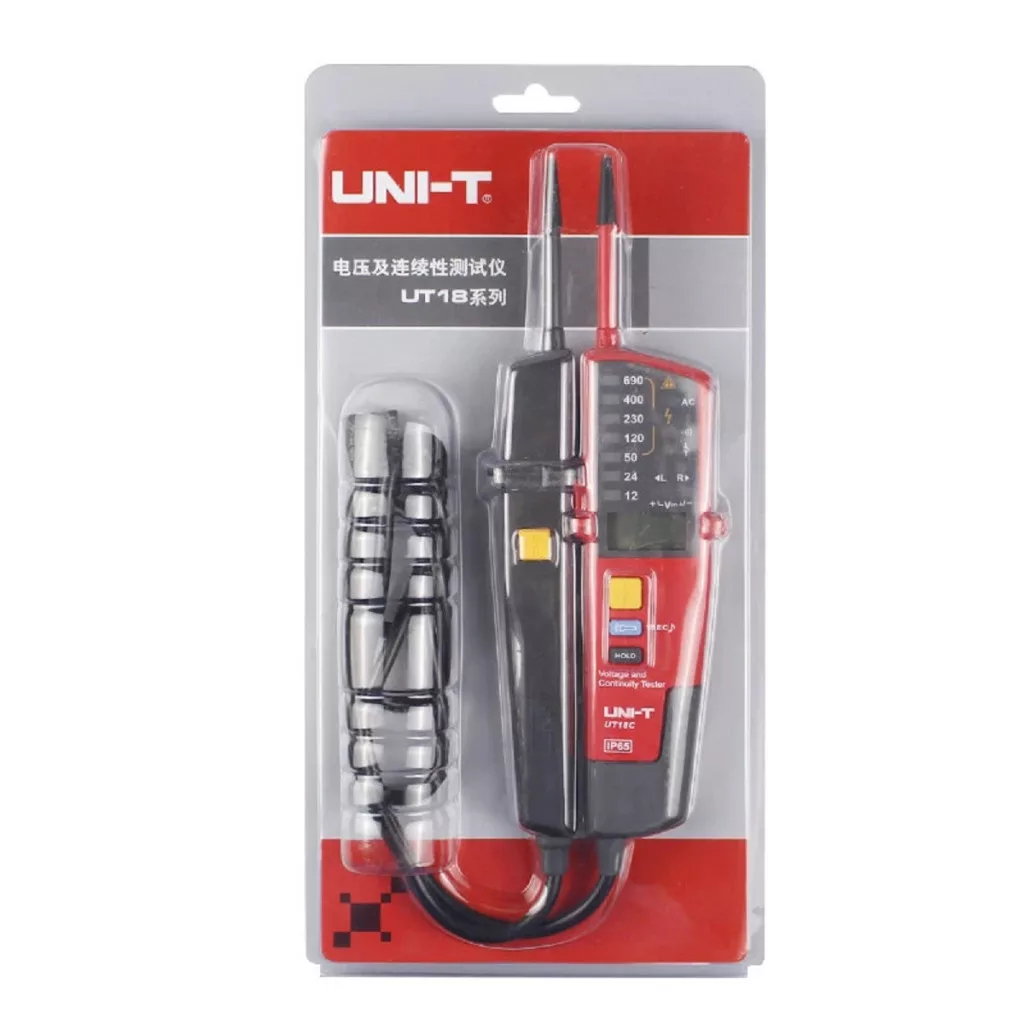 Az UT18 sorozatú tesztert AC / DC feszültség, háromfázisú feszültség, fázissorrend, folytonosság és egyebek tesztelésére tervezték. Ez a sorozat a CAT IV 600V kategóriába tartozik, és IP65 védettségű. Ezek a feszültségvizsgáló készülékek tökéletes eszköz a villanyszerelők számára a feszültségszintek gyors mérésére minden környezetben. Ezt a sorozatot NEM szabad 110V-os elektromos rendszerekkel használni. – Feszültség – Fázis forgásirány teszt -  RCD test (áramvédő kapcsoló teszt) – Egyvezetékes feszültségkeresés – Szakadásvizsgálat – Polaritás érzékelés – LED lámpa – Automatikus méréshatár – Világítás (lámpa) – Alacsony energiaszint jelzés – Csendes mód – IP65 védettség – Teljesítmény ~ 1.5V elem (R03) x2 – Súly ~ 280gr – Méret ~ 272x85x31mm – Tartalékok ~ elem