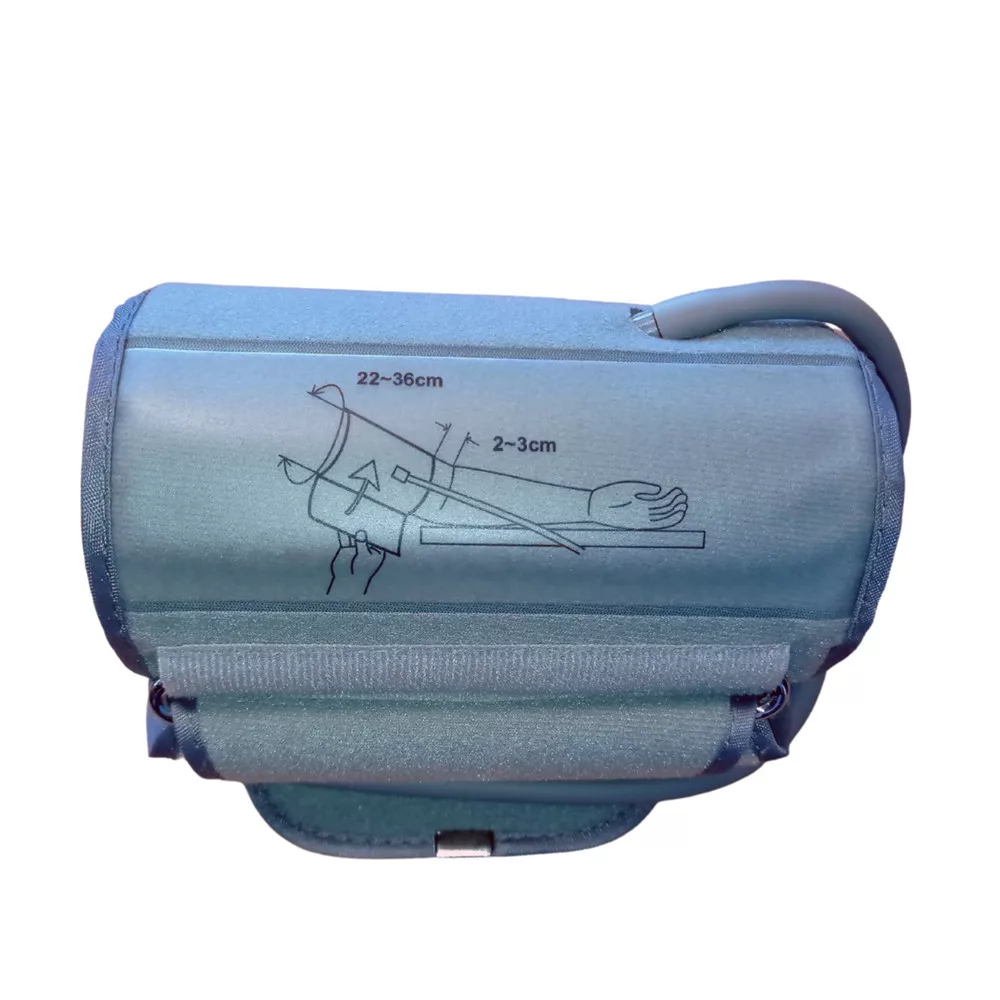 - Miután csatlakoztatta a mandzsetta vezetékét a vérnyomásmérő készülékhez, helyezze fel a bal felkarjára,1-2 cm-rel a könyök fölé úgy, hogy a vezeték a mandzsetta alsó végén legyen, a könyökhajlat felől, majd az öntapadó felület segítségével rögzítse azt.