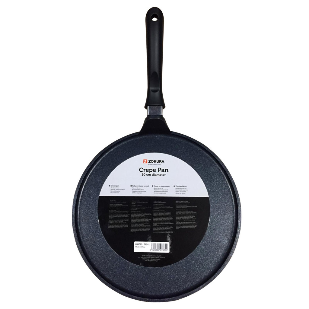 Zokura márkájú, 30 cm - es átmérőjű palacsintasütő, alumíniumból készült, Withford tapadásmentes belső réteggel. A serpenyő szilikon nyéllel rendelkezik. A tapadásmentes réteg védelme érdekében használjon szilikon, nejlon vagy fa spatulákat (lapátokat). Csak gáz- és in kerámia (vitroceramikus) főzőlapon használja. Ne használja indukciós főzőlapon. A serpenyőt csak kézzel tisztítsa, és az öblítés után azonnal szárítsa.