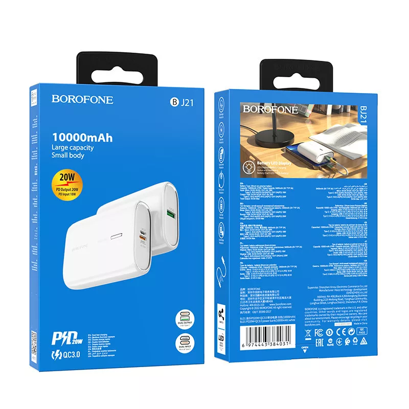 Borofone BJ21 Powerbank 10000mAh USB + Type-C PD 20W QC 3.0 18W fehér